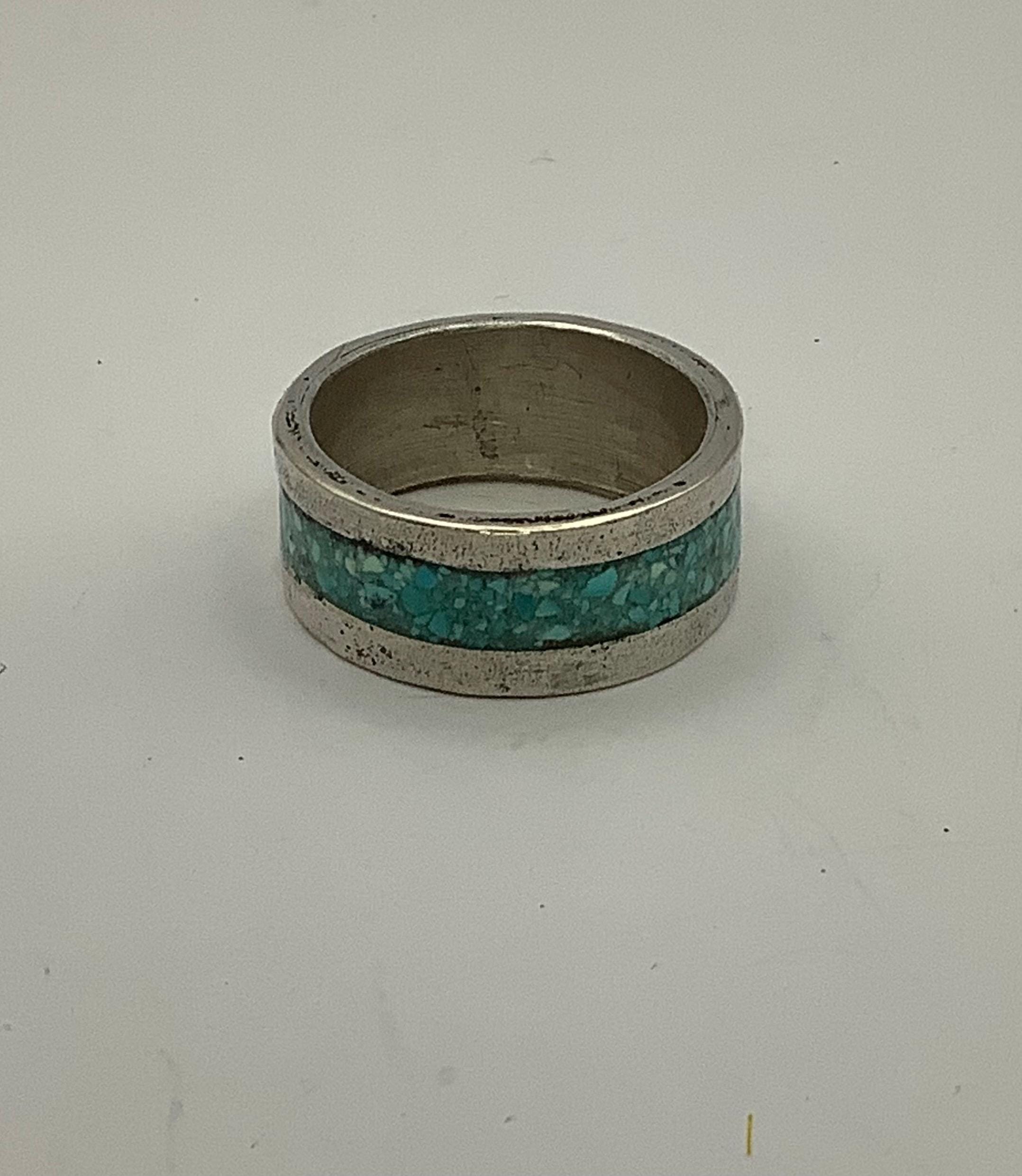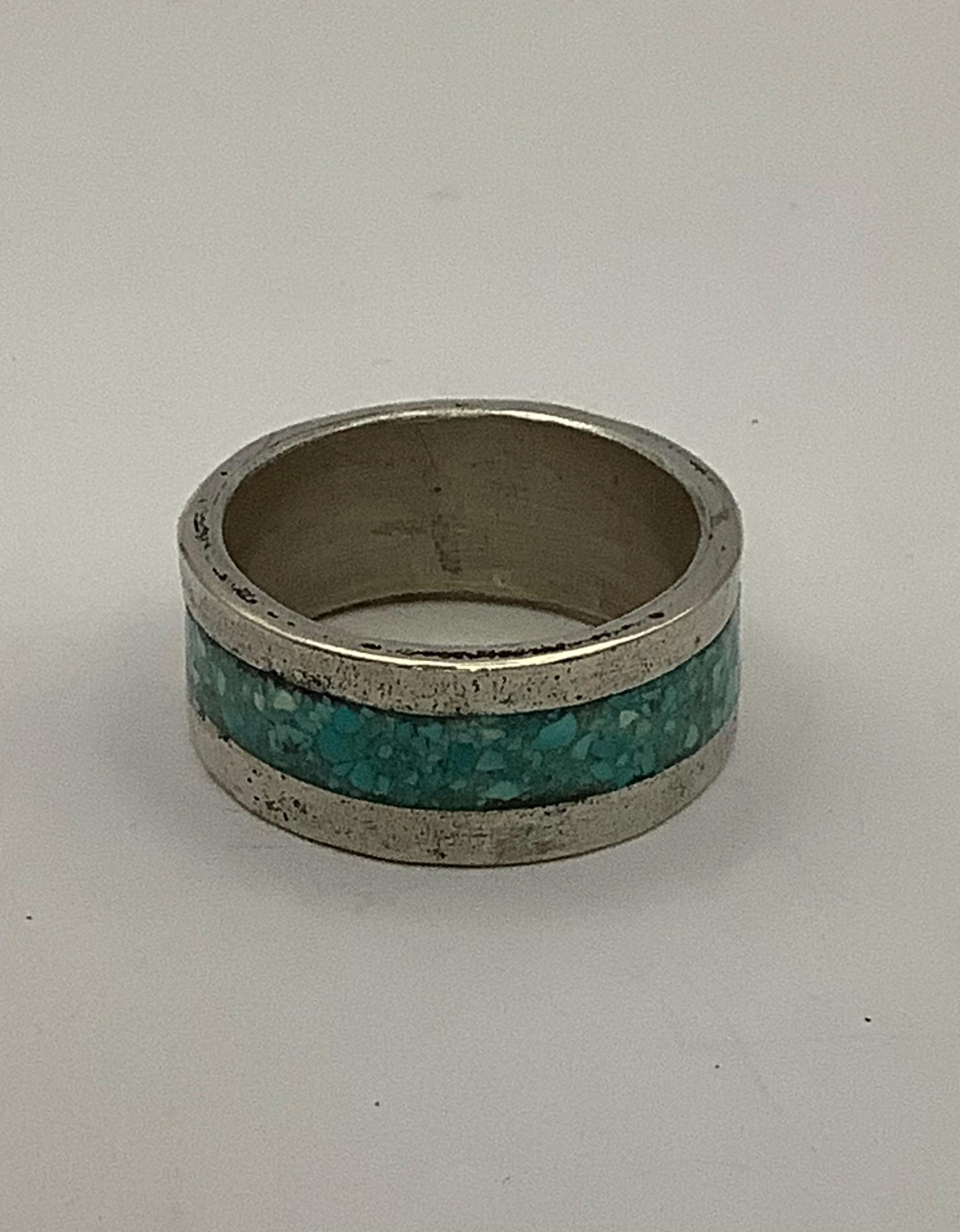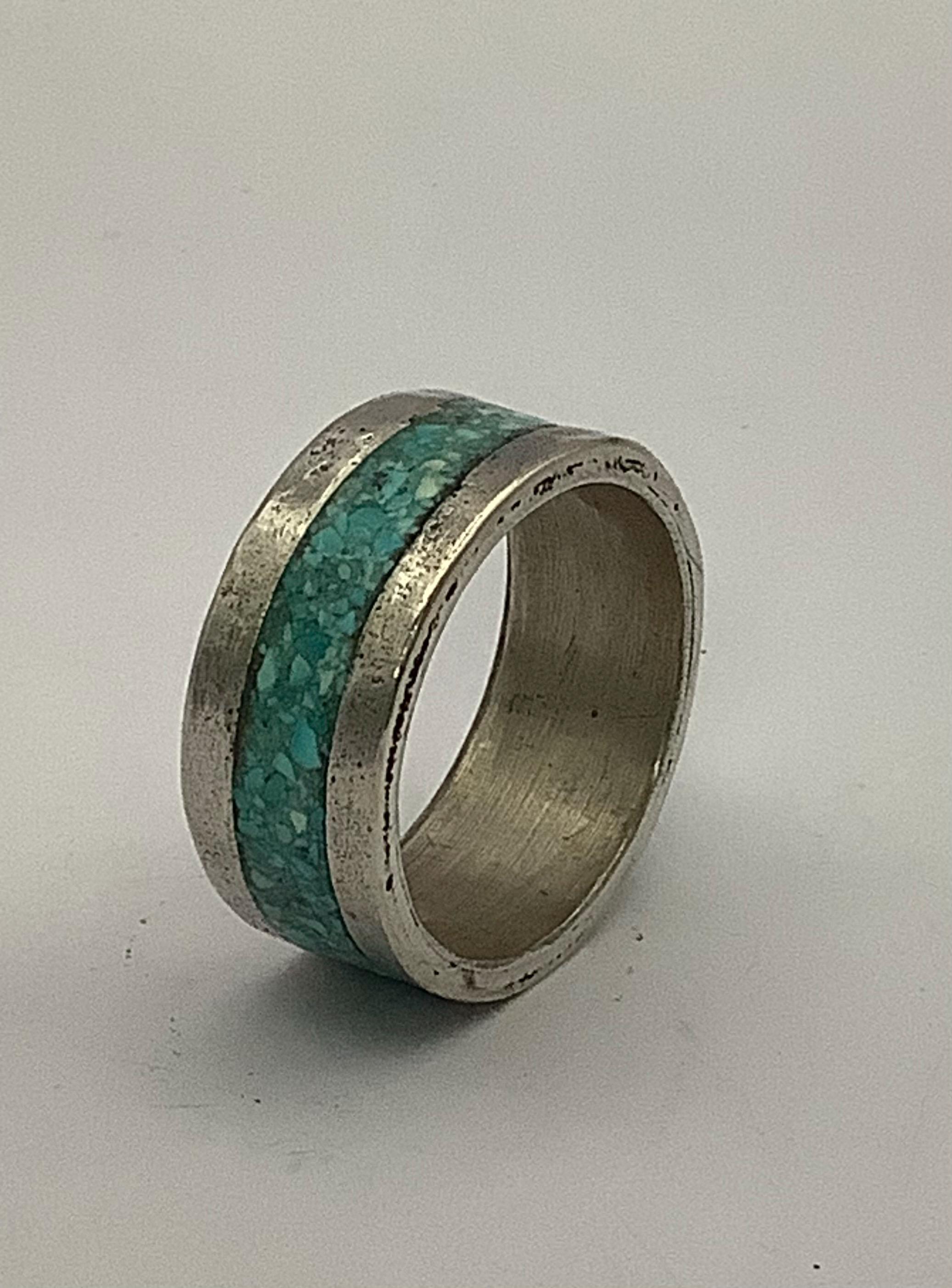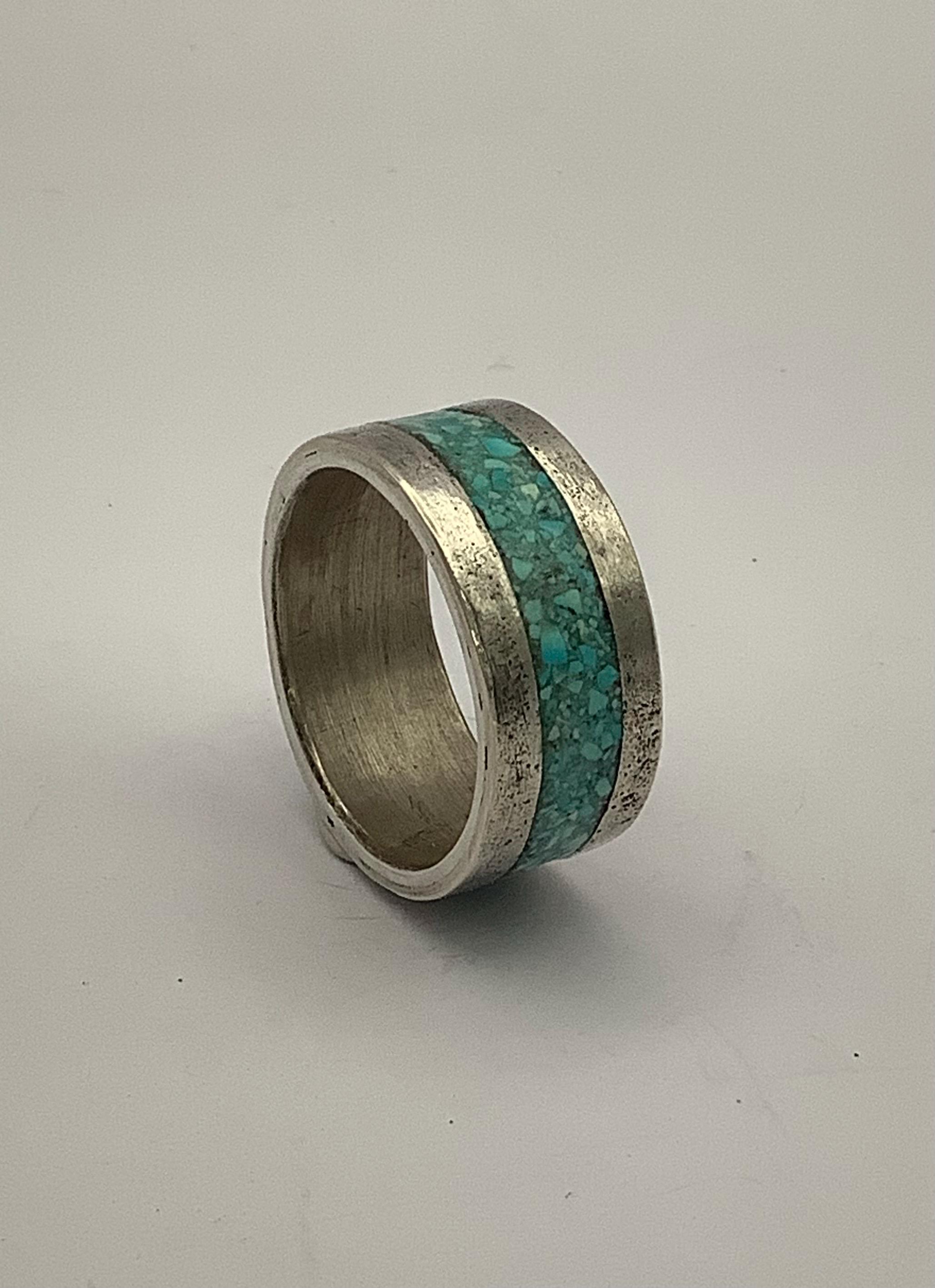 This mokume gane turquoise inlay ring is made with silver and copper composite. The mokume gane process is an ancient Japanese technique which gives a striking yet rustic look. Ring size is 9 1/2. Width is 3/8”.